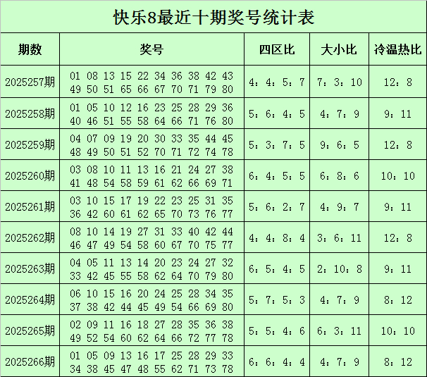 福彩快乐8第2025266期开奖回顾:01 05 09 13 16 17 25 28 29 33 34 38 45 47 48 55 62 71 73 78,其中奖号四区比为6:6:4:4,冷温热码比为4:7:9,大小比为8:12,和值为727,同尾号码为01 71、13 33 73、05 25 45 55、17 47、28 38 48 78、09 29。