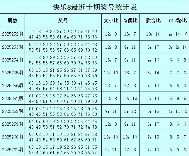 福彩快乐8第2025261期开奖回顾:03 10 15 17 19 22 23 25 31 35 36 42 60 61 62 65 70 73 76 77,其中奖号大小比开出9:11,奇偶比开出12:8,质合比开出7:13,012路比开出5:9:6。