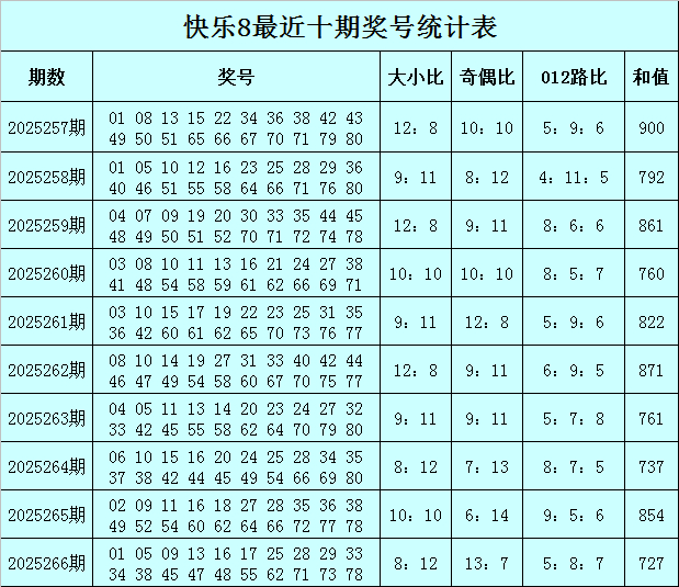 福彩快乐8第2025266期开奖回顾:01 05 09 13 16 17 25 28 29 33 34 38 45 47 48 55 62 71 73 78,其中奖号奇偶比开出13:7,大小比开出8:12,012路比开出5:8:7,和值为727,跨度为77。